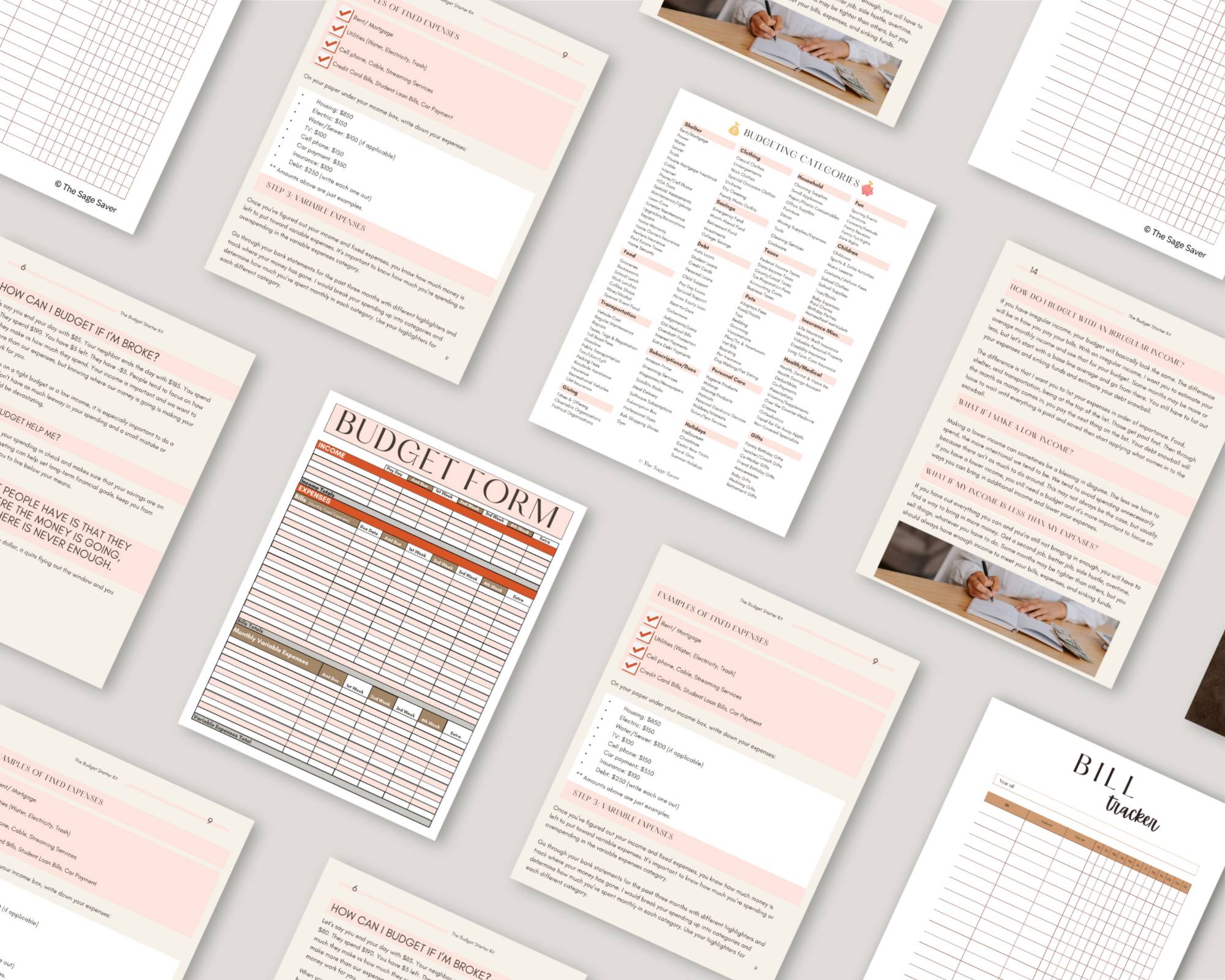 Includes a 20-page binder, mini ebook, and printable budgeting forms to plan your month, track spending, and reach your savings goals.